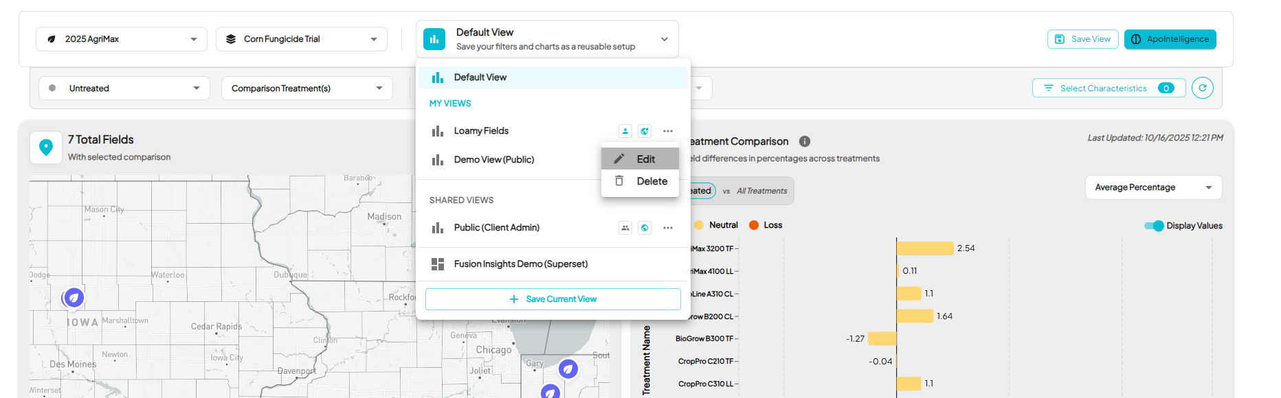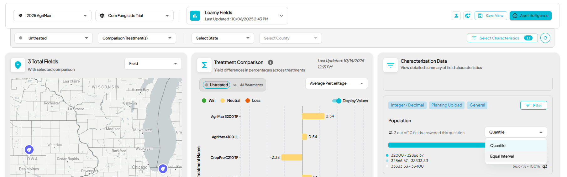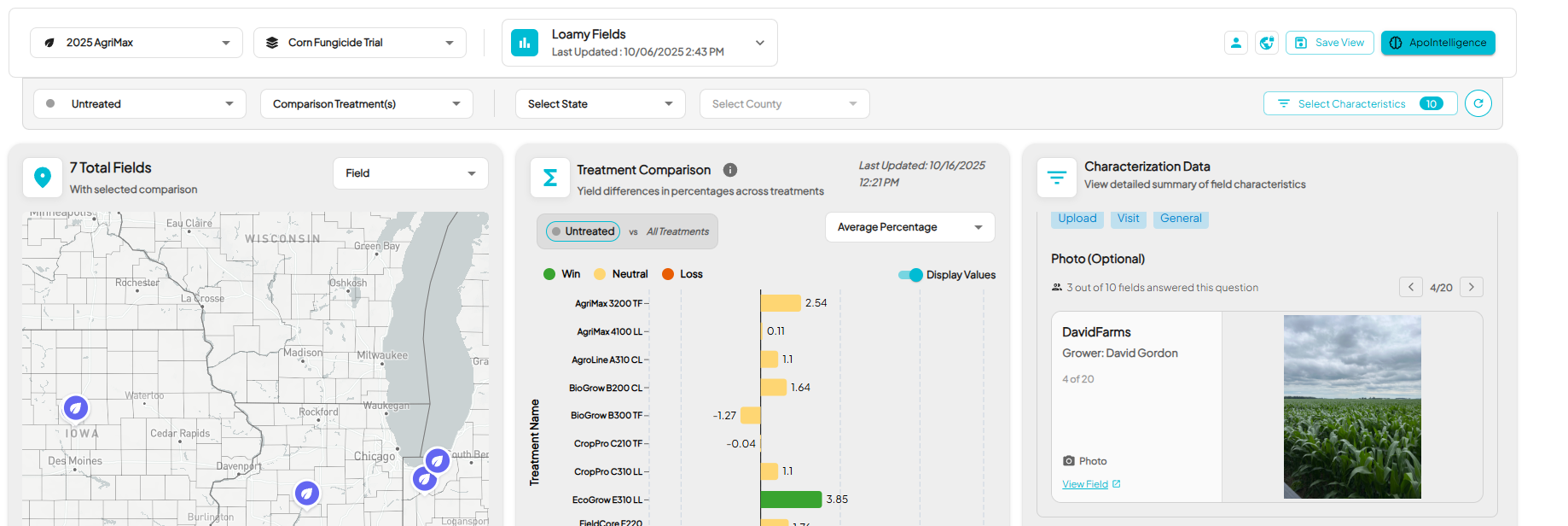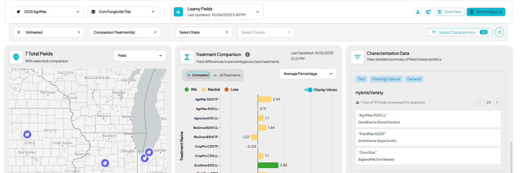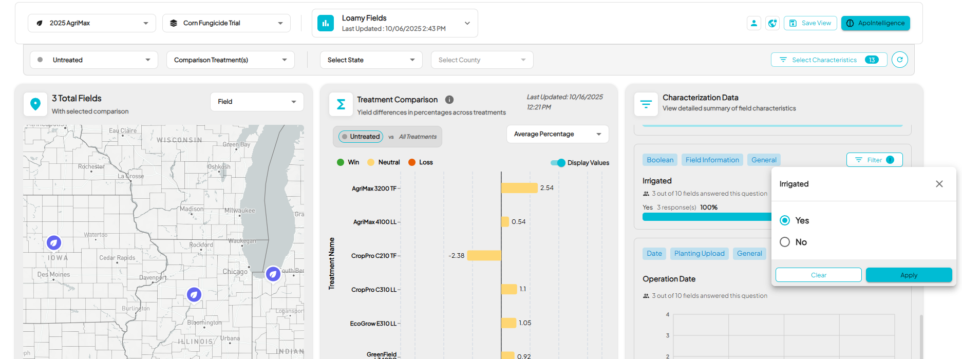 - The default view displays your map, Treatment Comparison, Yield by Field Comparison, and the Select Characteristics button on the right.
