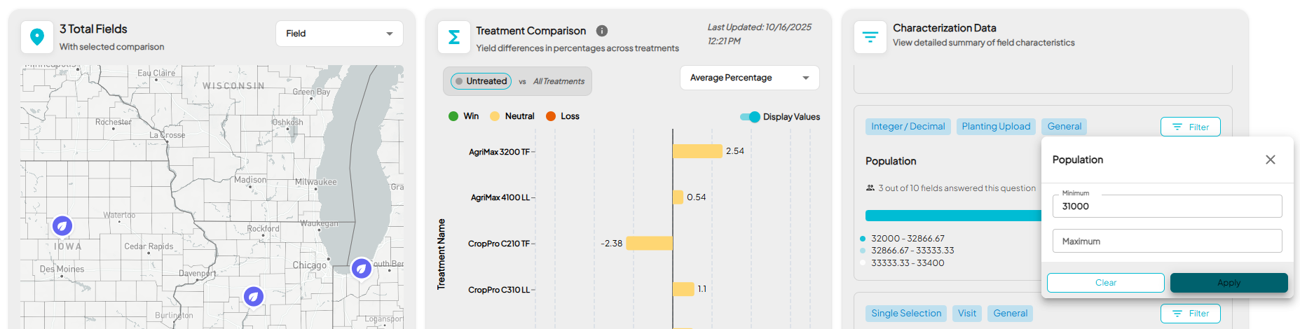- Automatically link them to the yield and treatment charts on the left meaning any filter you apply here also filters your yield analysis.
