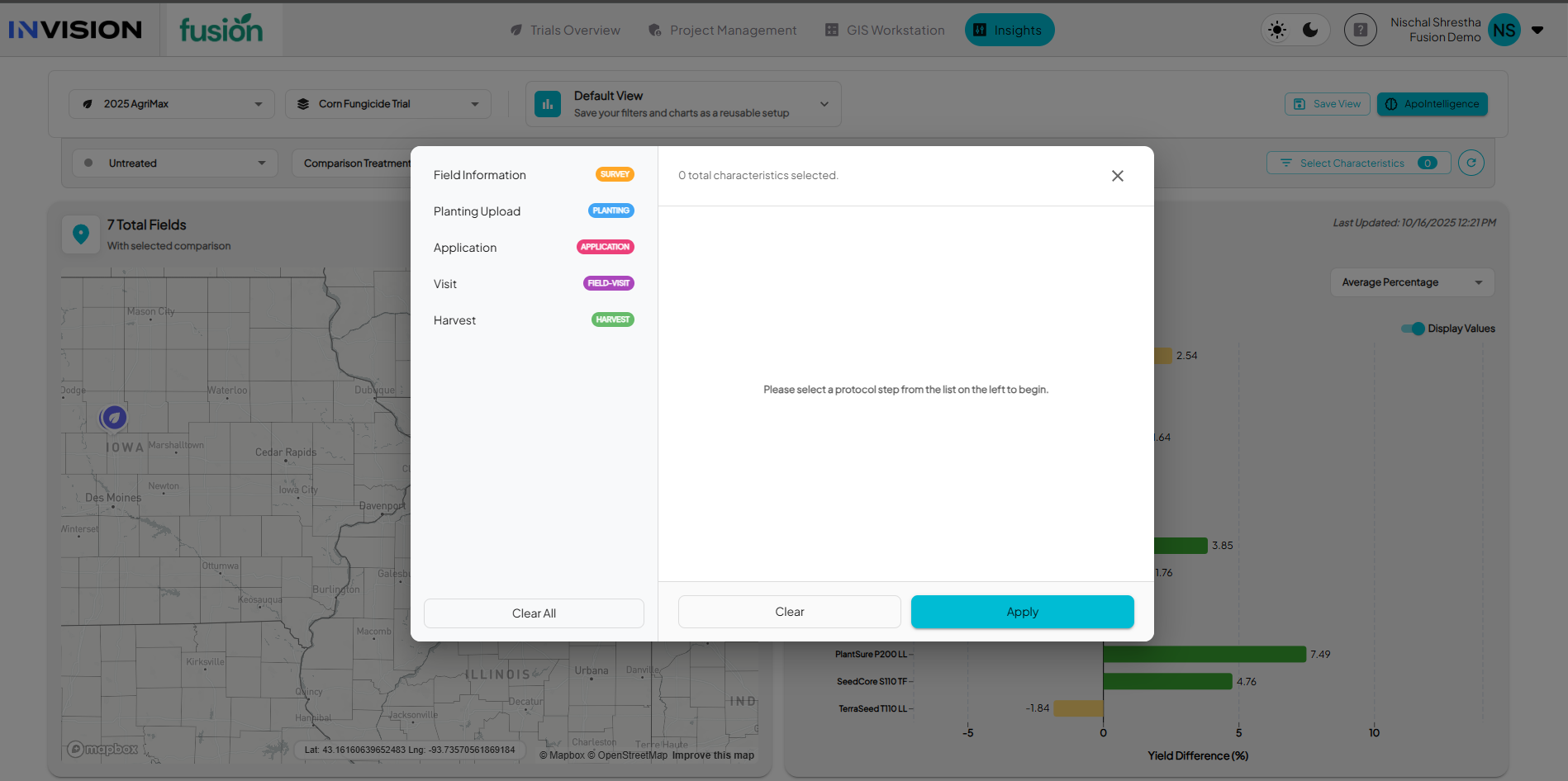 The Select Characteristics button is where you decide what data to bring into your Insights workspace. It defines what you can analyze across fields, treatments, and management practices.