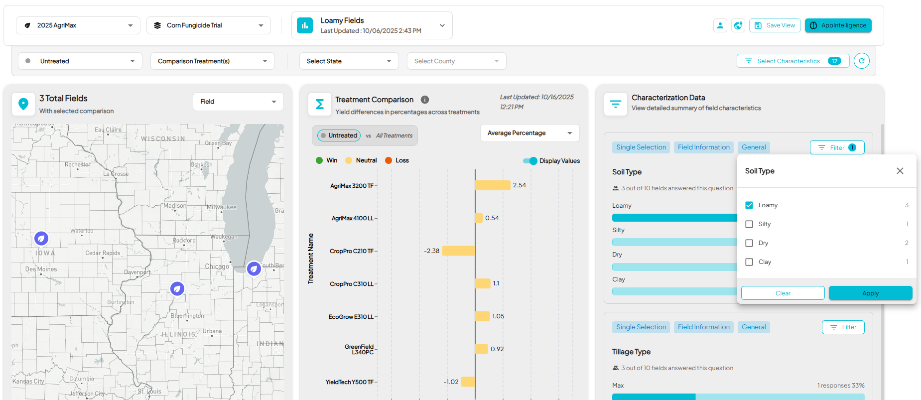 For example, if you filter Soil Type = Loamy, every chart and field shown in Insights will update to include only Loamy fields.